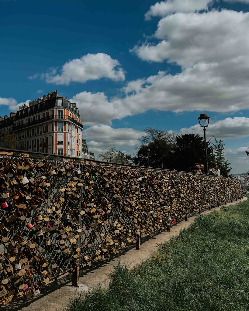 Climb the cobblestone paths to the Sacré-Cœur Basilica for stunning city vistas. The Sacré-Cœur Basilica is one of the most iconic landmarks in Montmartre. Perched atop a hill, it offers panoramic views of Paris. You can either take a leisurely walk up the hill or use the funicular to reach the basilica (I recommend taking the funicular up, and save your energy to take in the sights of Montmartre. Also, the funicular looks beautiful! Once you are up, wander around the Basilica, often you will see musicians performing some beautiful French music and also locks of love! You cannot tie locks now on the Pont Des Arts, but if you want to make promises of forever with your loved one, you can find places in Montmartre to tie locks. Some were tied up on lampposts because the government only cuts down locks once a place fills to the brim with them. Get creative 🙂