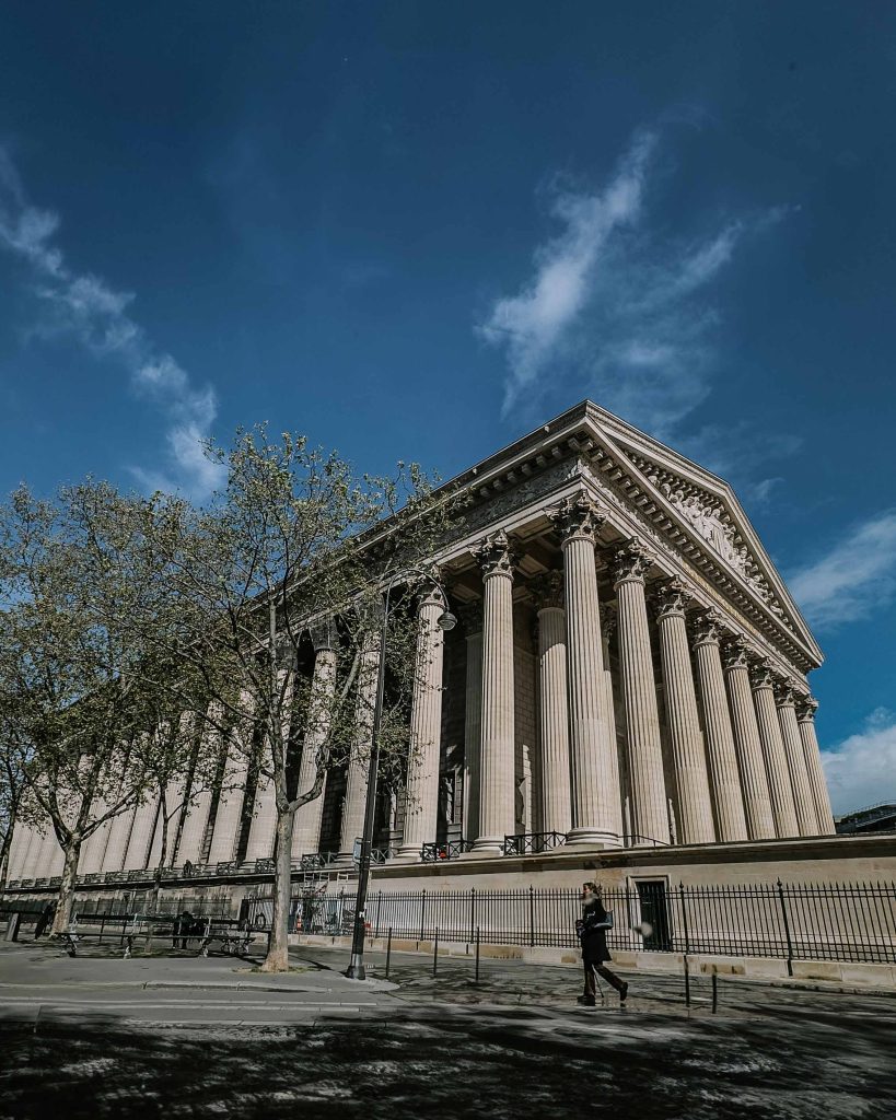 Near the Luxembourg Gardens is La Madeleine, a prominent church in Paris, known for its striking neoclassical architecture and historical significance. Modeled after a Roman temple. It is particularly notable for its massive Corinthian columns, of which there are 52, surrounding the building. I found it by accident and was struck by how pretty it looked.